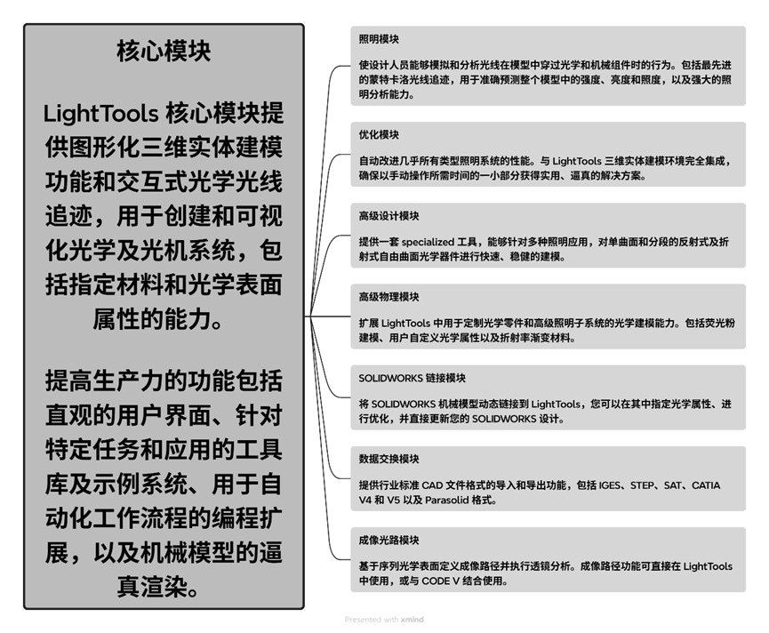 LightTools 包含多个模块,可以根据您的特定应用需求进行许可配置。核心模块是所有其他模块的前提条件,其他模块包括照明模块、优化模块、高级设计模块、高级物理模块、SOLIDWORKS 链接模块、数据交换模块和成像光路模块。这些模块无缝协作,为照明系统提供完整的设计和分析解决方案。